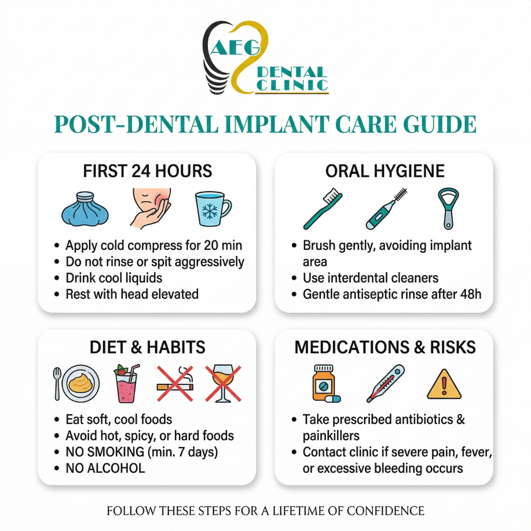 Congratulations on completing your implant surgery at AEG Dental Clinic. To ensure the best possible results and a smooth integration of the implant with your jawbone (osseointegration), please follow these professional care instructions closely.